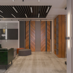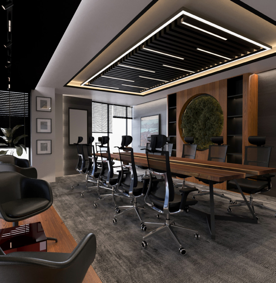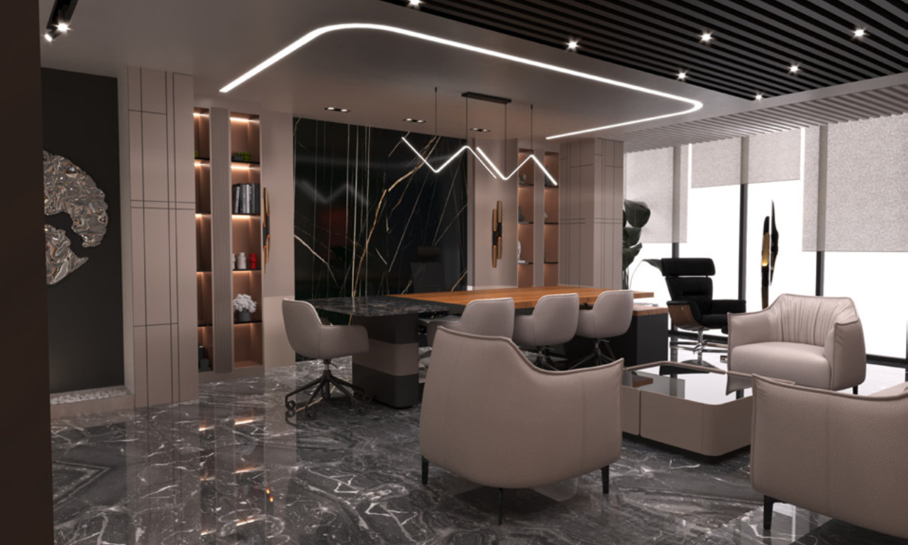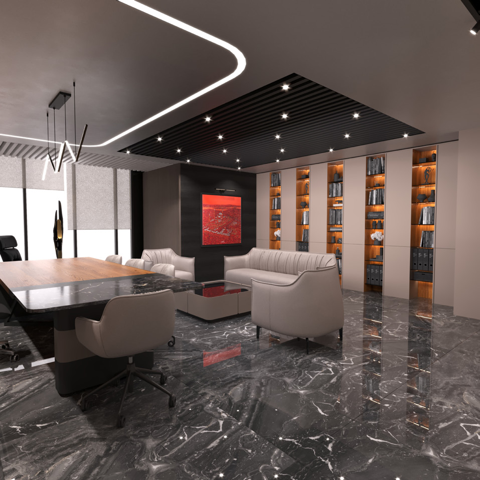 • Malzeme Prestiji: Mermer efektli zeminler ve zengin malzeme kontrastları, ofisin kurumsal duruşunu ve prestijini pekiştirir.