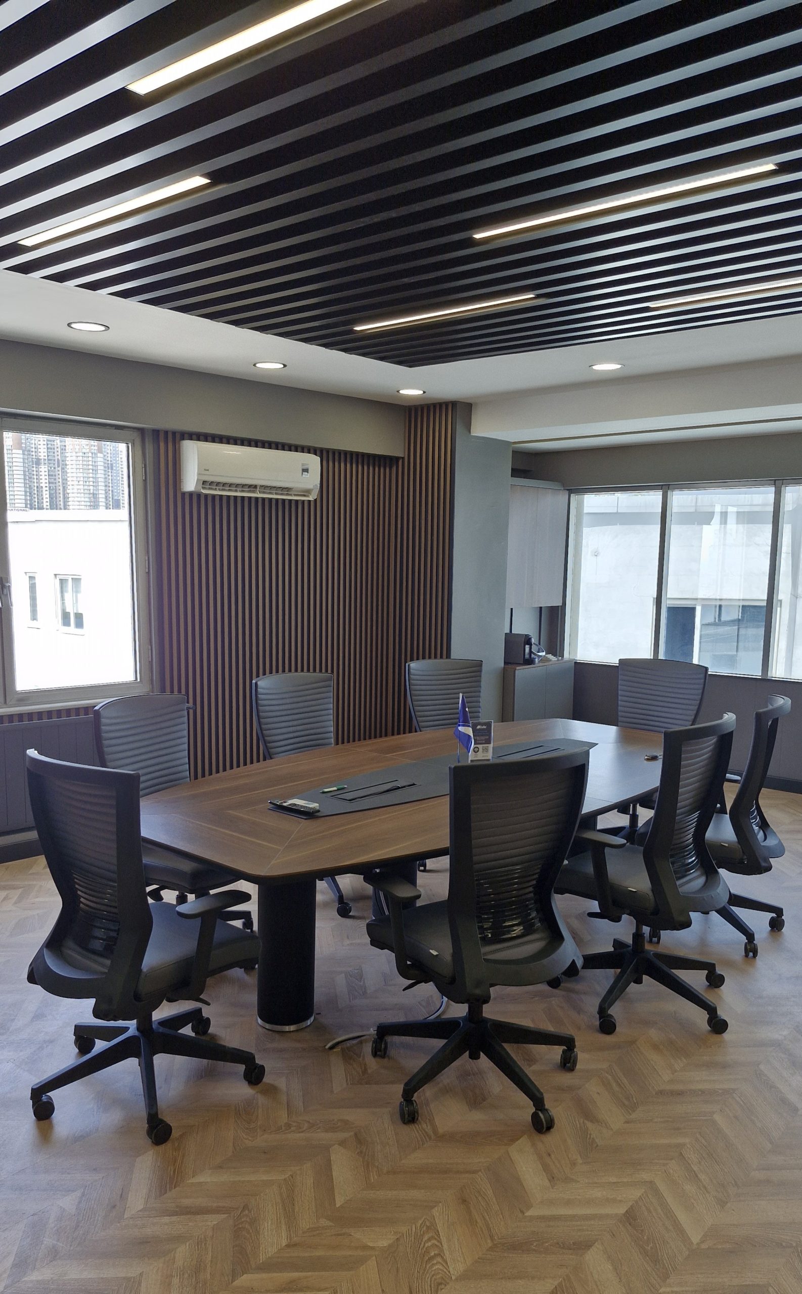 - Akustik ve Görsel Kimlik: Baffle tavan sistemi, toplantı alanlarında üst düzey akustik konfor sağlarken güçlü bir görsel imza oluşturur.