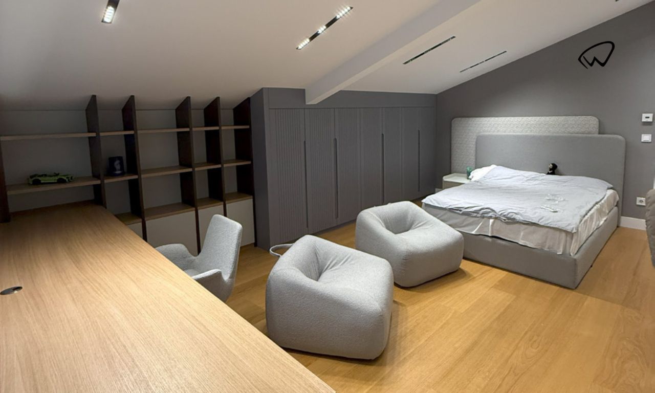 • Eğimli tavan yapısı ve geniş pencere açıklığı, mekânın doğal ışıkla dolmasını sağlayarak hem görsel bir ferahlık hem de duygusal bir konfor alanı oluşturur.